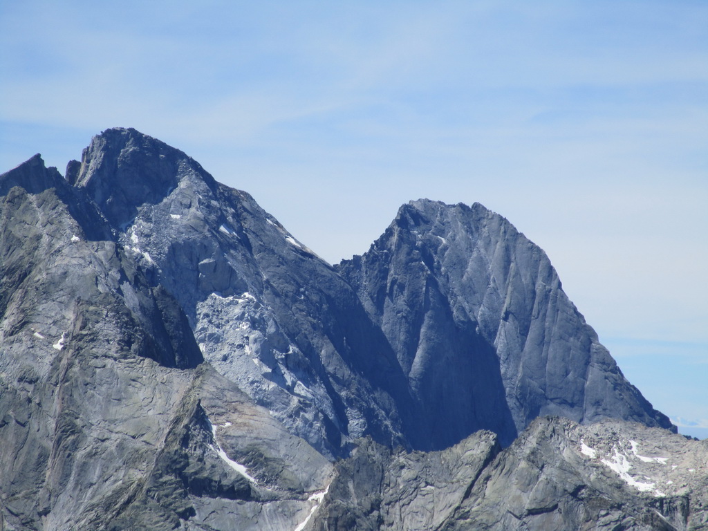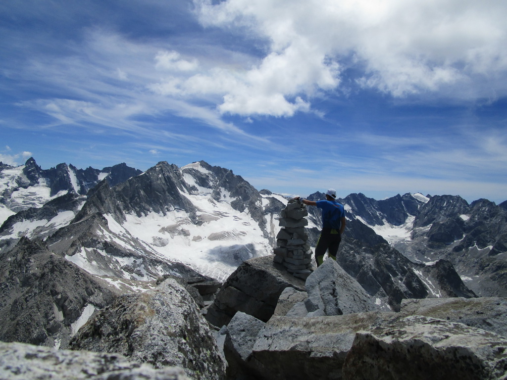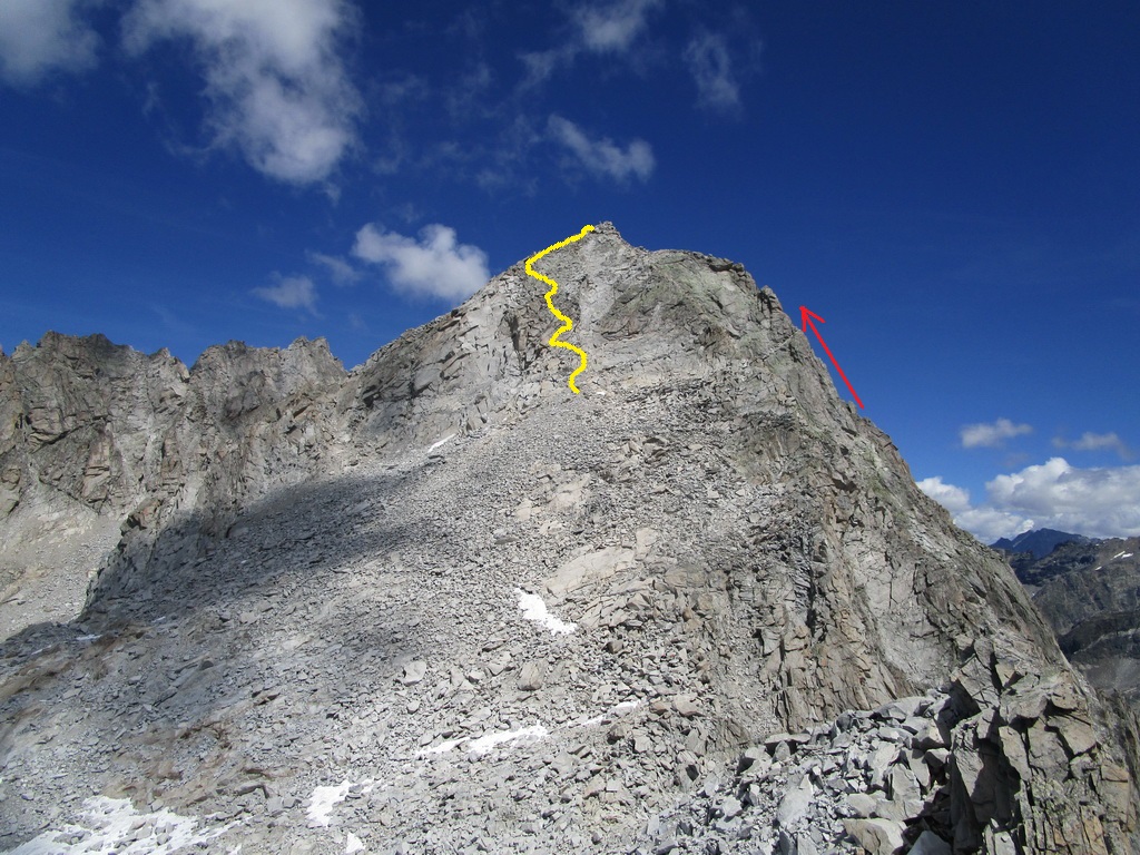 poskytuje parádne a tutové chyty. Jedno exponované miesto v ktorom visia smyčky obliezam sprava a potom už po hrebeni valím až na vrchol. Tu následuje kochanie určite nie tuctovou panorámou. Ešte neviem ako dole takže adrenalín na vrchole neopadá. Pamätám si len, že som čítal: "Po mužíkoch dole smerom údolie Albigna". A naozaj, ani by som neveril, že mužíci vedia tak spoľahlivo ukázať pomerne komplikovaný zostup... no takmer ako na Gerlachu :))) ;)