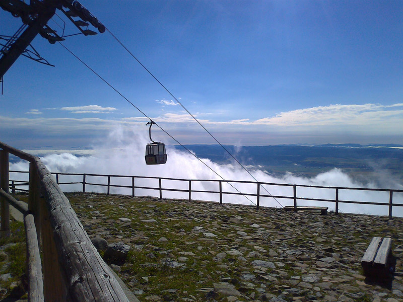 Všetky verzie náhradného programu v prípade hnusného počasia definitívne padli vo Svite, kde sa pomedzi hustú hmlu začínalo predierať slnko a modrá obloha. Pôvodný plán vyšliapať pekne pešo po svojich na Skalnaté pleso a odtiaľ na nástup pod stenu zlyhal, keď nám ráno nešiel vlak, a tak sme použili „klasickú“ turistickú alternatívu a nechali sme sa „nešportovo“ vyviezť prvou lanovkou z Lomnice spolu s davmi ceprov, dúfajúc, že to nezníži hodnotu nášho „výkonu“.