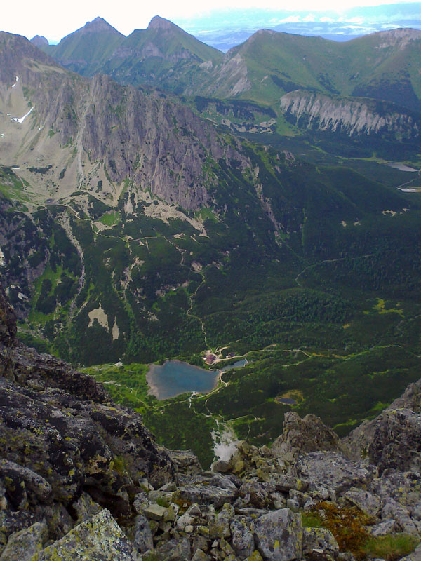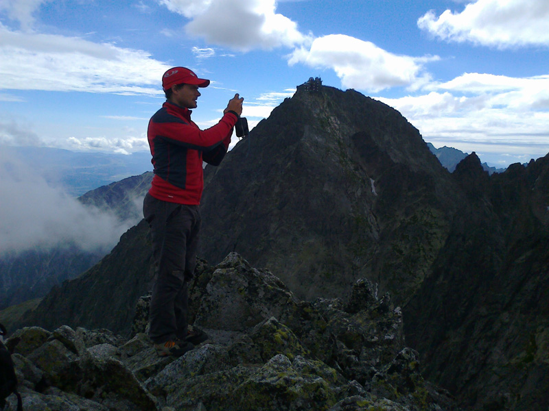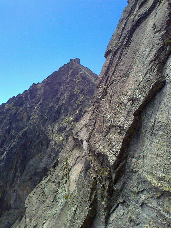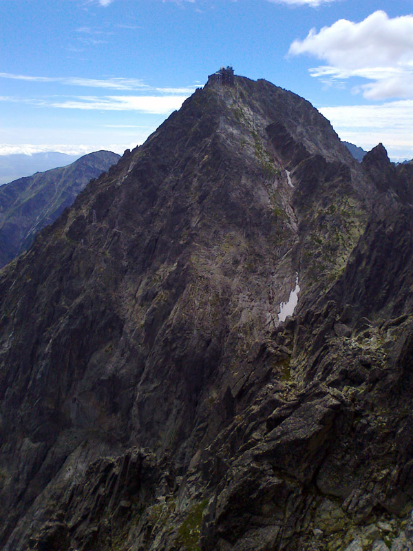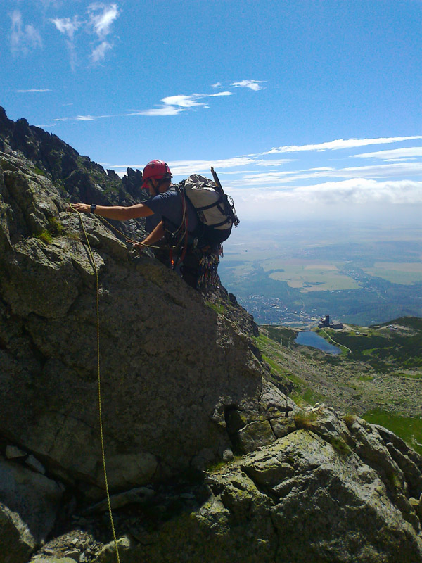 Problémové miesta som nepostrehla - ide o pekné, ľahké lezenie, aj keď sme mali cestu miestami zatečenú. Celý čas krásne výhľady na Lomničák a Skalnaté pleso. Lezecký čas (ak nerátam nástup pod stenu) predstavoval približne 4 hoďky, čo bolo podľa môjho spolulezca a šéfa expedície veľmi biedne, ba až zlé :-))) Ale ja som si cestu užívala a keď je niečo dobré a krásne, tak je predsa fajn, keď to trvá čo najdlhšie :-)) Na vrchol sa ide už pešo po kameňoch. Zo štítu perfektne vidieť východnú časť Vysokých Tatier, Belianky, Lomnický štít a Vidlový hrebeň, ktorý je akousi jeho spojnicou s Kežmarákom. Naša zostupovka smeruje do Huncovského sedla, dole Svišťovkou na Brnčalku. Pekný deň za nami. Predpovedaný dážď nás stíha až tesne pred chatou.