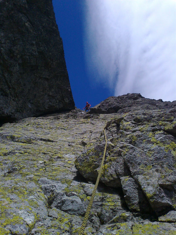 Slnko pečie. V Skalnatej dolinke si chladia bruchá na fľakoch snehu zvedavo pozerajúce kamzíčie rodinky. A sme na mieste. Ja v klasickej úlohe hlavného ističa, doliezača a fotografa. Naväzujeme sa na lano a vyrážame, zároveň s lanovkou na Lomničák, ktorá nám v ten deň prefrčí ponad hlavy asi 1000 krát. Celá trasa ľavým vhĺbením je peknou logickou líniou, ktorá ako zisťujeme je nanovo preistená - nielen štandy, ale aj nity na postupové istenia, takže niet kde zablúdiť.
