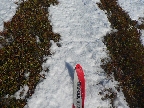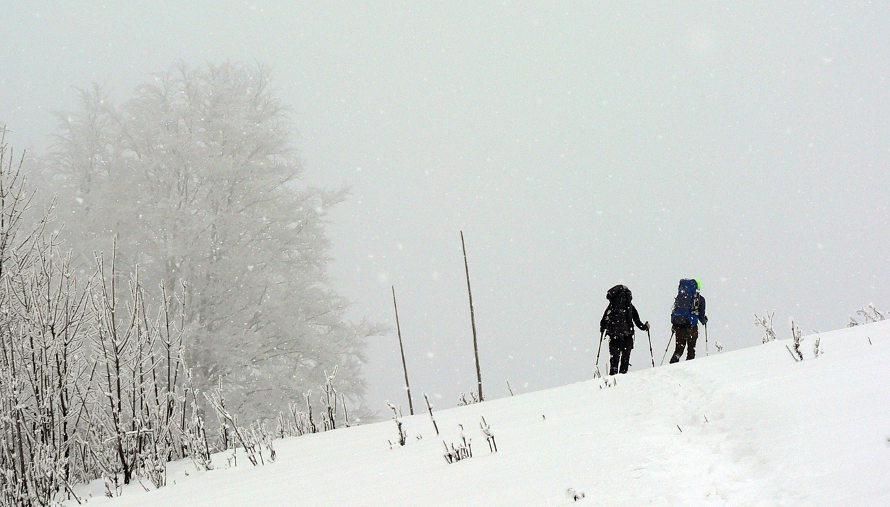 Od Košariska už je to komfort, tyče sú a hlavne: vidno od jednej k druhej :-) Pod Skalkou niekto lyžoval, zrazu mám aj pre lyže stopu, ale teším sa krátko. Spoza stromu najprv pes („Lidi nežere, jenom nechce uhýbat.“), potom päť borcov. Lebo idú na pešo a boria sa po kolená. Vraj sú zvyknutí... Ale ako tá stopa vyzerá... Našťastie kôrka drží, šmýkam povedľa. Spoločnosť mi robí jemný severáčik s arómou ružomberskej celulózky :-)
