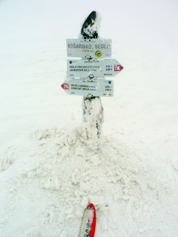 Tak prerážam. Do Hiadeľského sedla ešte po rovinke, to je rozcvička. Že sa blížim pod elektriku, spoznám podľa jej mohutného bzukotu. Zvláštny pocit... Potom strmina na Prašivú. Veľa nového snehu, cez týždeň zmäknutého a prisadnutého, na tom taká polotuhá kôrka a centimeter prášku. Presvitá aj staršia stopa, dole by sa celkom dobre oblúčikovalo, miesta je. Len na krátkom úseku na hrane lesa musím kosovku poriadne oklepať, aby sa dala podliezť. Obísť nejde. Potom zopár cik-cakov nad lesom: čerstvého snehu ubudlo, treba niekde do kôrky aj lyžou lepšie seknúť. Keď sa sklon zmierni, už je to pohodlnejšie, až k smerovníku na Prašivej.