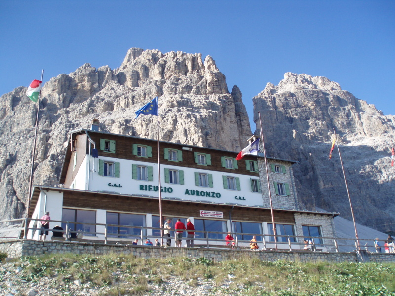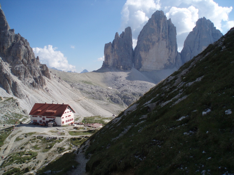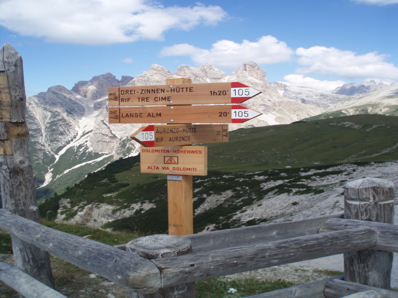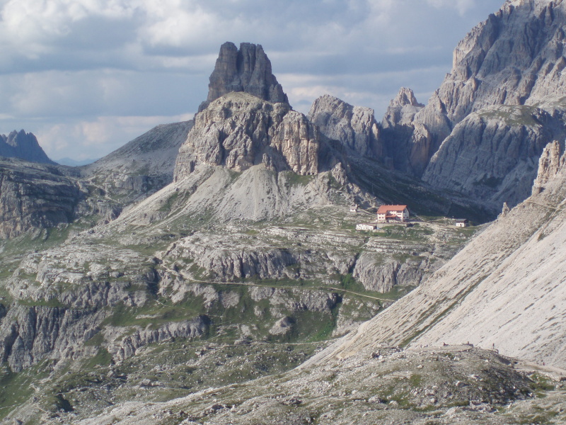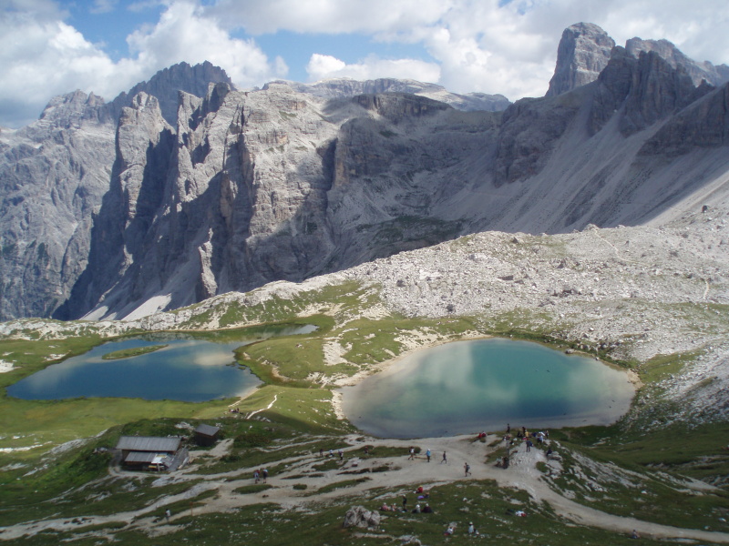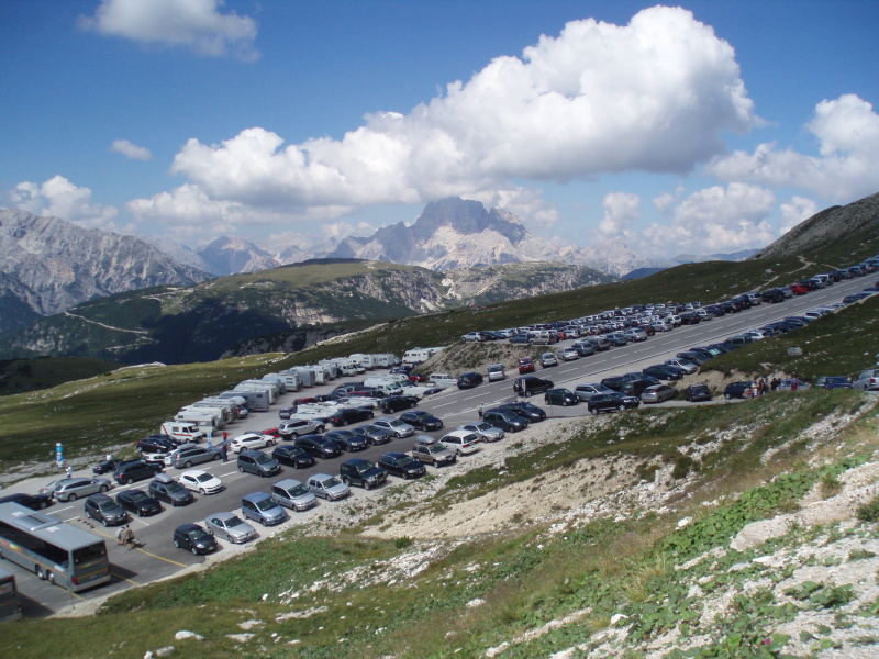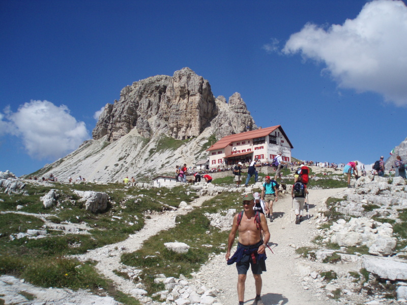 Po rozbalení stanu a zabývaní sa, zvažujeme kam sa vydáme na zvyšok dňa. Rozhodli sme sa pre túru okolo Tre Cime di Lavaredo. Pre pokročilý čas si chceme skrátiť cestu a ušetriť hodinu šľapania. V obchode si kupujeme lístky na autobus, ktorý nás vyvezie pod známe tri veže, ku chate Rifugio Auronzo (2320 m n.m.). Tu sú totálne preplnené parkoviská a všade navôkol je kvantum ľudí. Po chodníku č. 105 ideme do sedla Forc. del Col de Mezo a prechádzame na severnú stranu za tri veže. Pokračujeme na chatu Rif. Tre Cime – A. Locatelli (2405 m n.m.). Celou cestou obdivujeme Tre Cime a množstvo lezcov v severných stenách. Po pravej ruke máme na očiach dominantné M. Paterno (2744 m n.m). Pri chate si dáme pauzu na občerstvenie a poradu o ďalšom pokračovaní dnešnej túry.