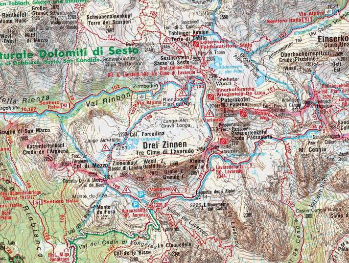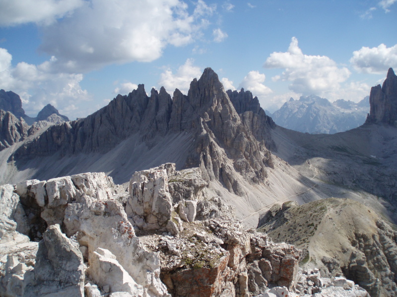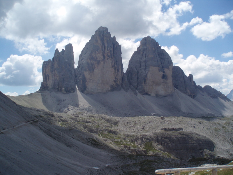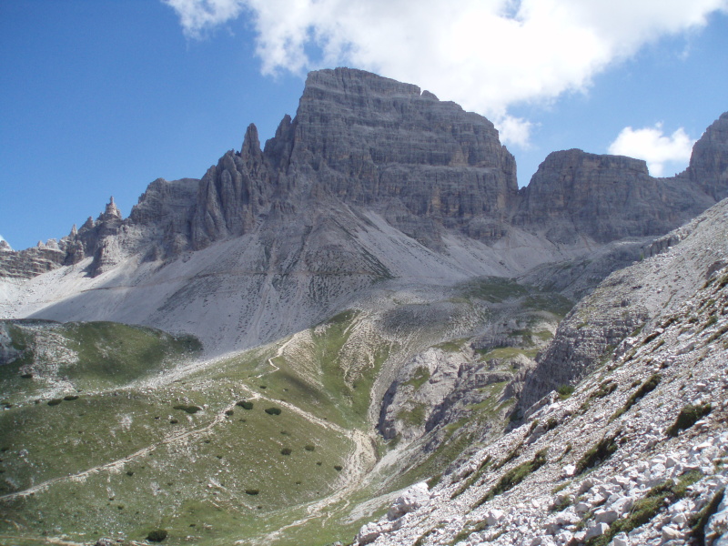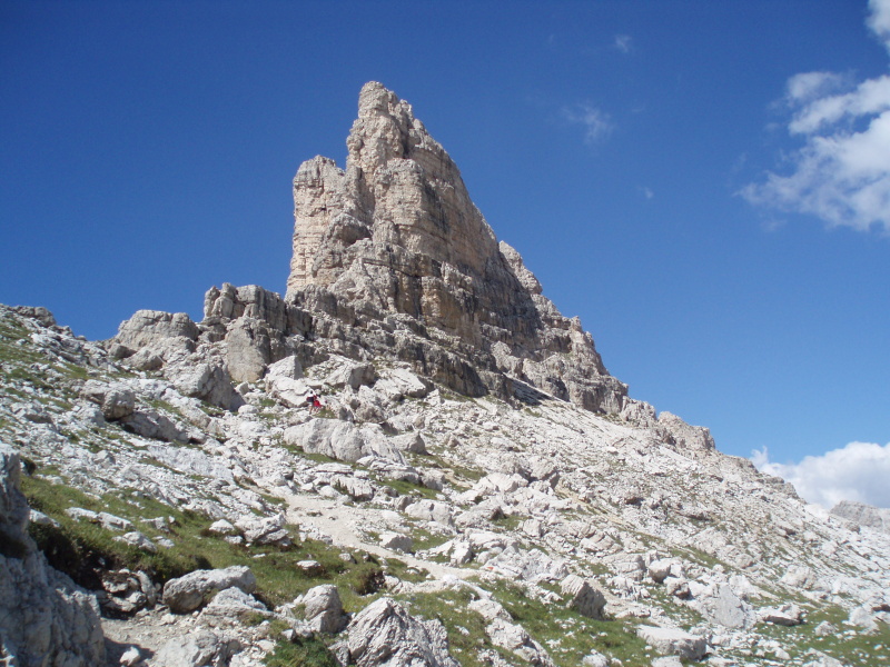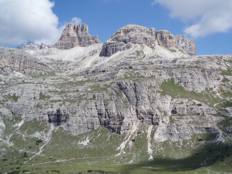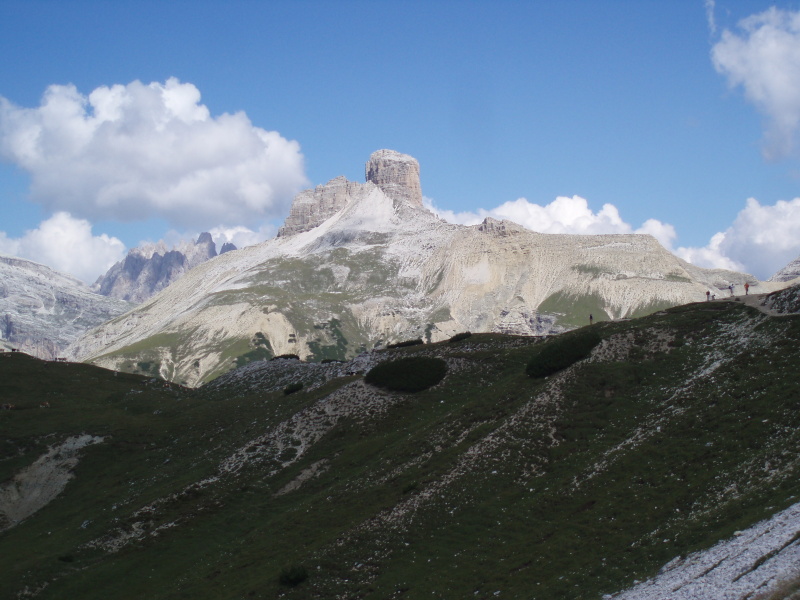 Po rozbalení stanu a zabývaní sa, zvažujeme kam sa vydáme na zvyšok dňa. Rozhodli sme sa pre túru okolo Tre Cime di Lavaredo. Pre pokročilý čas si chceme skrátiť cestu a ušetriť hodinu šľapania. V obchode si kupujeme lístky na autobus, ktorý nás vyvezie pod známe tri veže, ku chate Rifugio Auronzo (2320 m n.m.). Tu sú totálne preplnené parkoviská a všade navôkol je kvantum ľudí. Po chodníku č. 105 ideme do sedla Forc. del Col de Mezo a prechádzame na severnú stranu za tri veže. Pokračujeme na chatu Rif. Tre Cime – A. Locatelli (2405 m n.m.). Celou cestou obdivujeme Tre Cime a množstvo lezcov v severných stenách. Po pravej ruke máme na očiach dominantné M. Paterno (2744 m n.m). Pri chate si dáme pauzu na občerstvenie a poradu o ďalšom pokračovaní dnešnej túry.