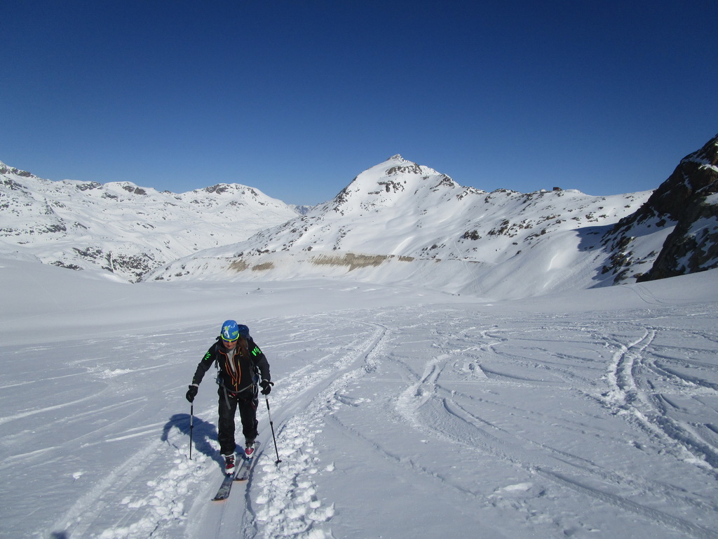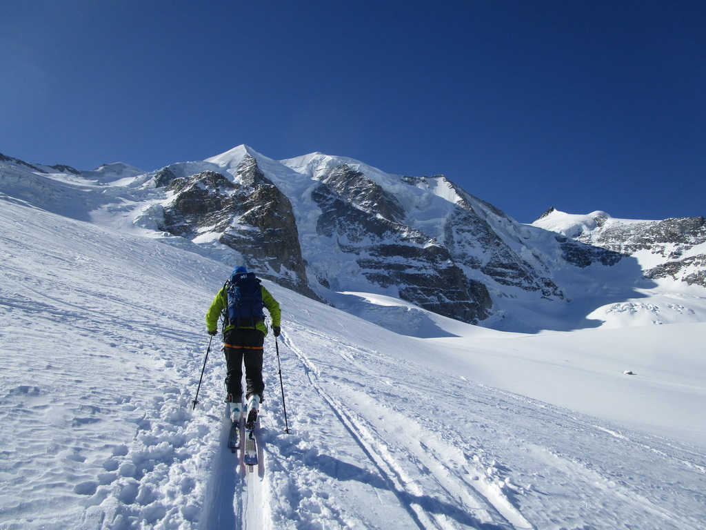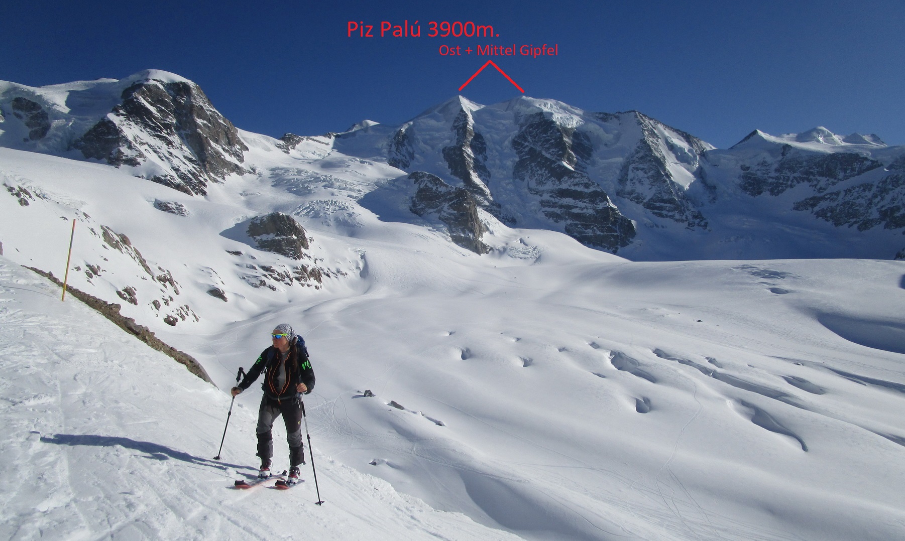 Lyžujeme dole na ľadovec svahom vľavo popod Piz Trovat. Tam už sa chystajú na výstup prvé skupinky. Túra na Piz Palú je veľmi populárna aj napriek tomu že vedie cez nepríjemný ľadovec.