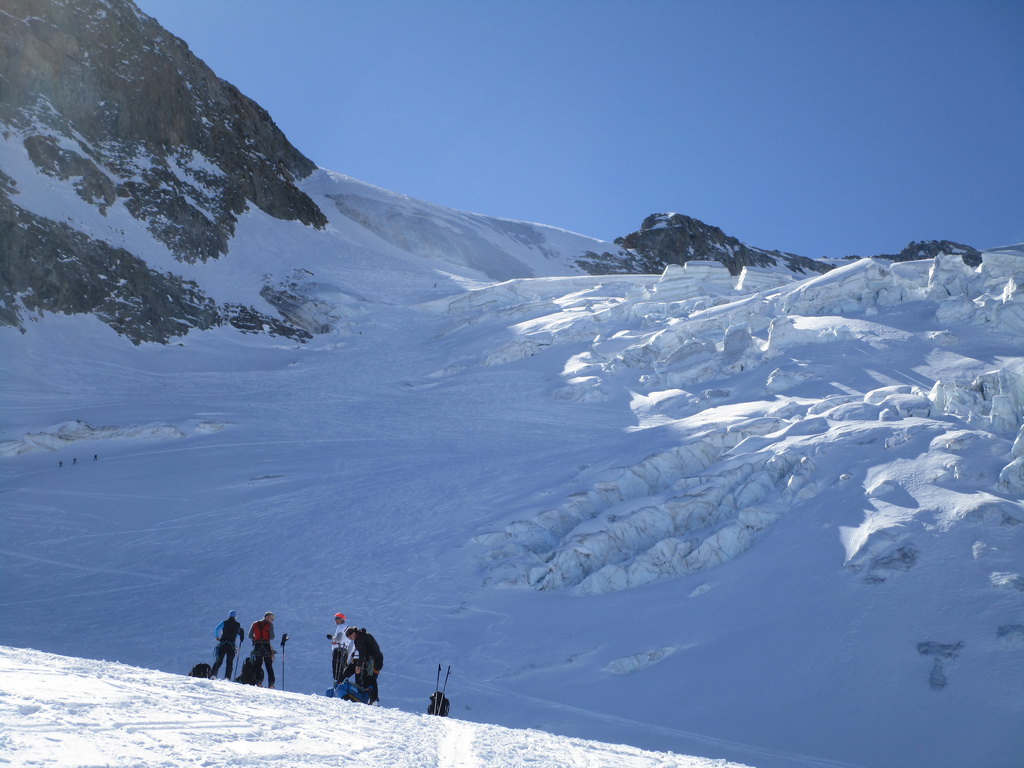 Začíname šlapať nenaviazaní, lano vyťahujeme až po prvom výraznom ľadovcovom zlome, ľadovec doteraz vyzerá mierumilovne. Ľudia šlapú pred i za nami. Zatiaľ sme na problém nenarazili aj keď v ľadovcovom zlome trebalo dať na pár metrov dole lyže. Po prejdení druhého plata sa terén pristrmuje.