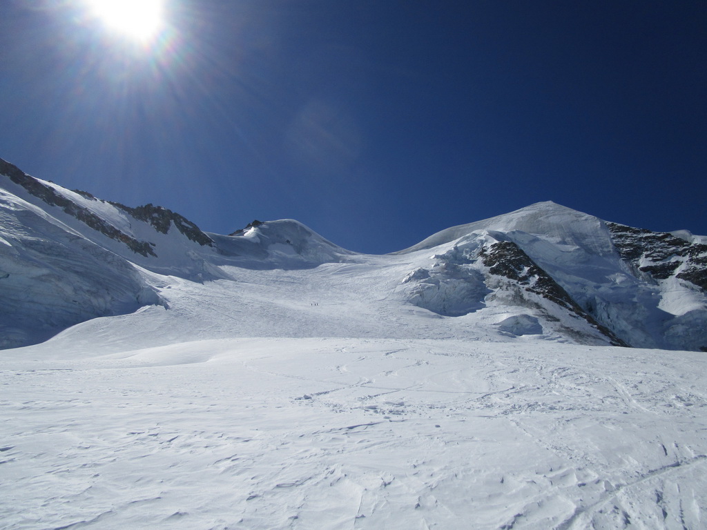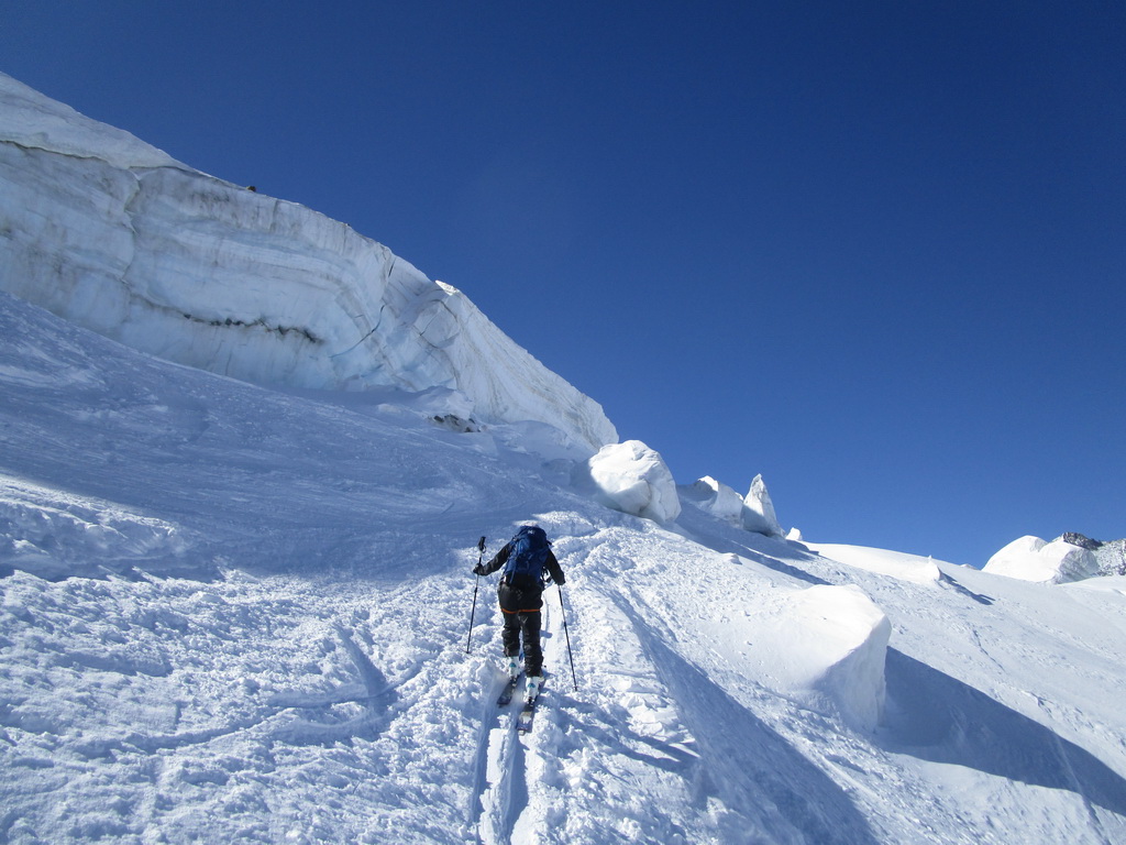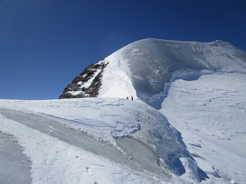 Ďalej ideme opäť na lyžiach. Klučkujeme medzi trhlinami ktoré sa rysujú pod snehom. Prichádzame do sedla pod vrcholom. Ten je celý ľadový iba na hrebeni je nalepený sneh po ktorom sú vyšlapané stopy.