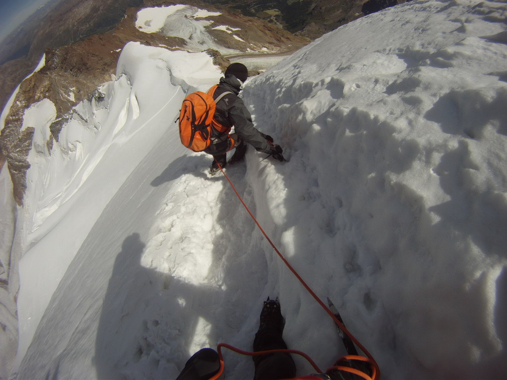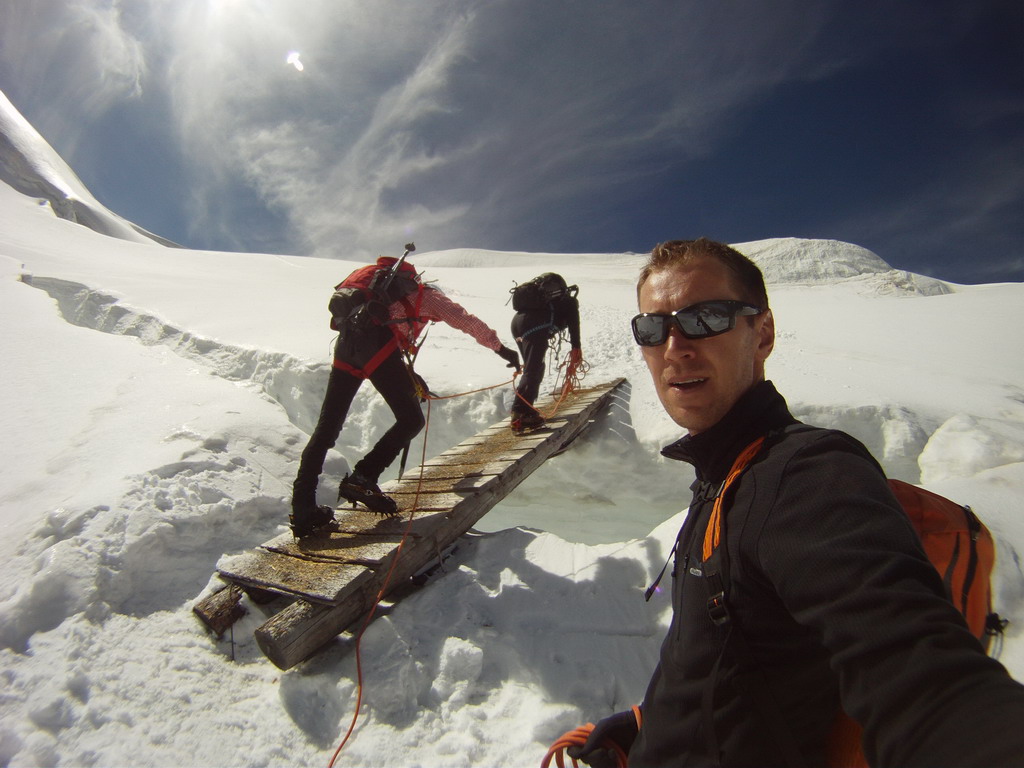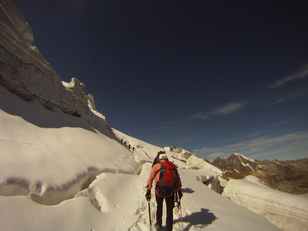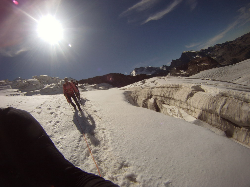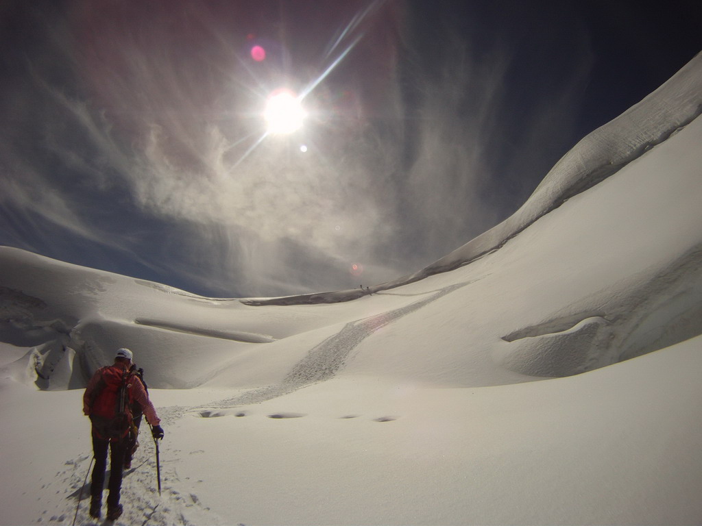 Tam sme sa naviazali a ďalej pokračovali po ľadovci. Začiatok je plochý, dlhý ľadovec, ktorý začne stúpať až asi po 20 minútach šliapania. Treba prejsť labyrintom medzier gigantických rozmerov a dostať sa do vrchnej časti, ktorá je už celistvejšia. Vo vrchnej časti je ešte jedna veľká medzera, prechod ktorou je riešený dreveným mostom (v lete). Odtiaľ je to už len kúsok k sedlu F. pers-palu, kde sa nechávajú v zime lyže a vystupuje sa prudkým svahom na hrebeň, smerujúci k východnému (pred)vrcholu Palu.
