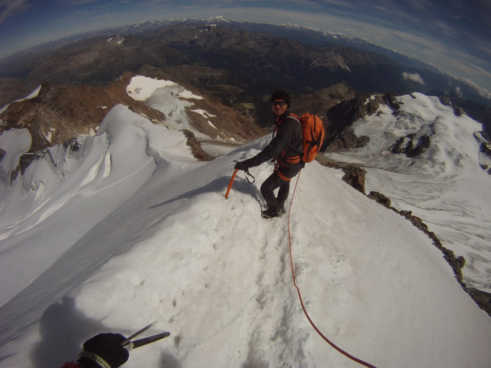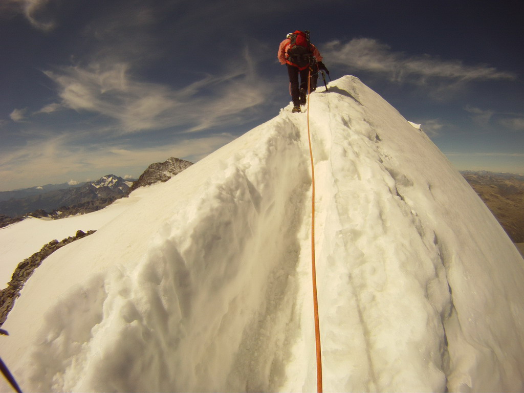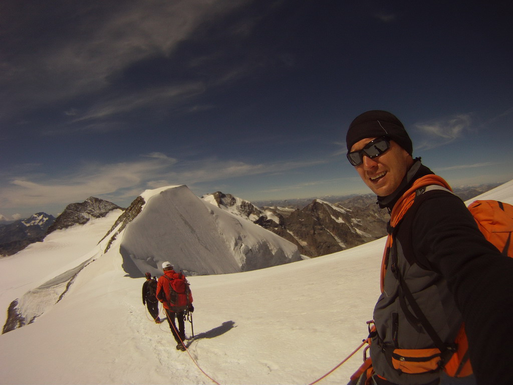 Na východnom vrchole dávame čaj, obliekame bundy a pokračujeme po hrebeni na hlavný vrchol Piz Palu 3905mnm. Na vrchole si podávame ruky, dáme energetickú tyčinku, spravíme rýchlu vrcholovú fotku a ponáhľame sa dole. Predposlednú lanovku nestíhame, tak nastupujeme do poslednej s personálom, rozčuľujeme sa (na oko), prečo môže personál ísť s nami, keď my sme ráno nemohli s personálom, aj keď bez odozvy. Nevadí... vo Švajčiarsku treba veľa veci prekúsnuť. Veď má najvyššie a najkrajšie vrcholy v Európe....