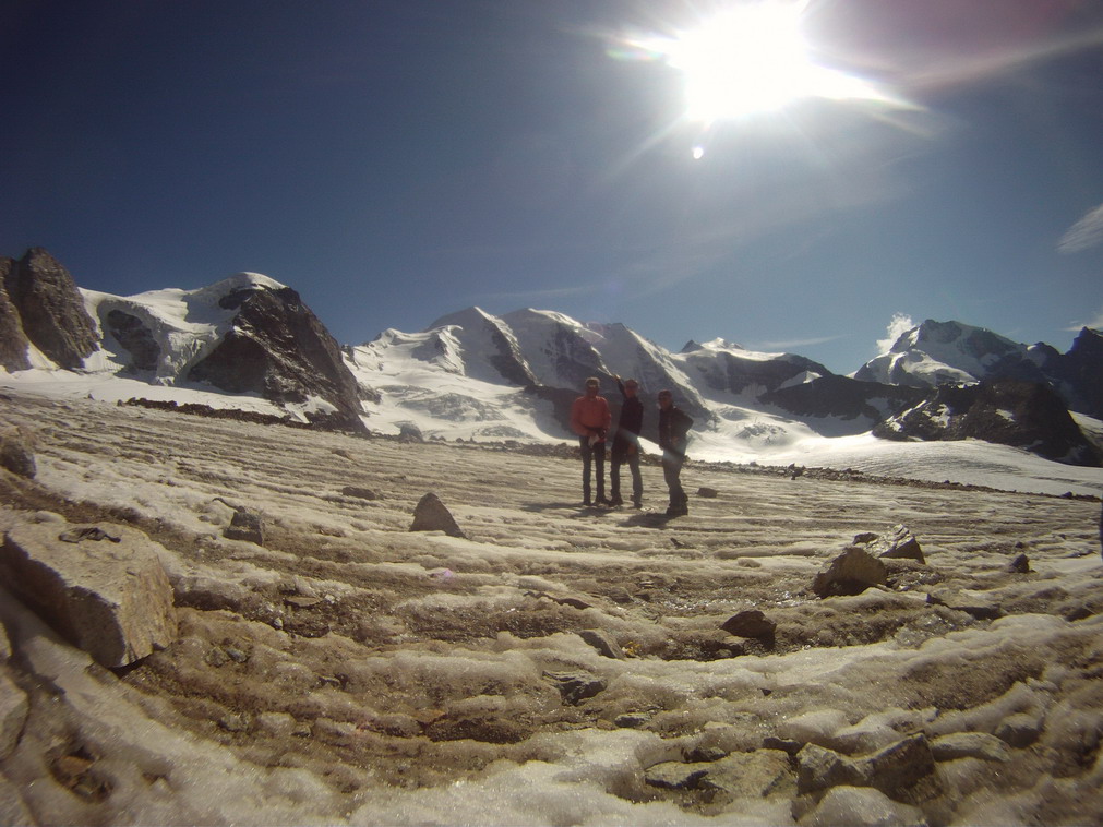 Prvá lanovka ide o 8:30, pokúsili sme sa dostať do tej o 8:00 pre personál, ale neúspešne, aj keď bola poloprázdna. Čo už, také je Švajčiarsko. Z vrchnej stanice Diavolezy sa treba dostať dole na ľadovec, čo je pri výstupe na Piz Palu najvýhodnejšie po značkách na Piz Trovat (pozor, nie na feratu, ale normálkou) po modrej značke a tam, kde sa začína strmé stúpanie na Piz Trovat, treba ísť stále rovno traverzom, až k sedlu, z ktorého je to už len asi 100m dole na ľadovec.
