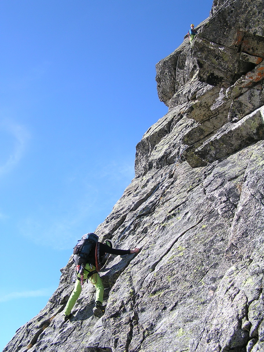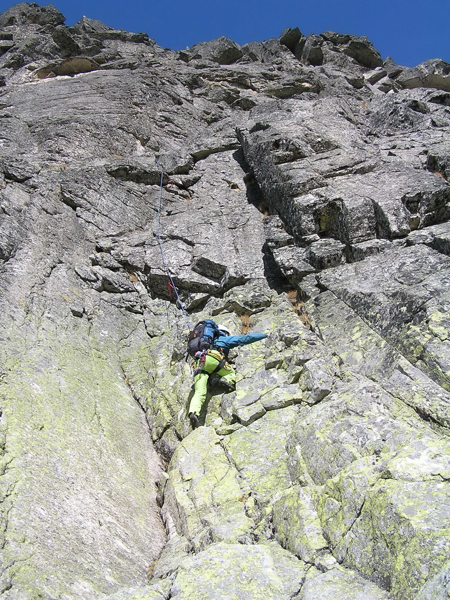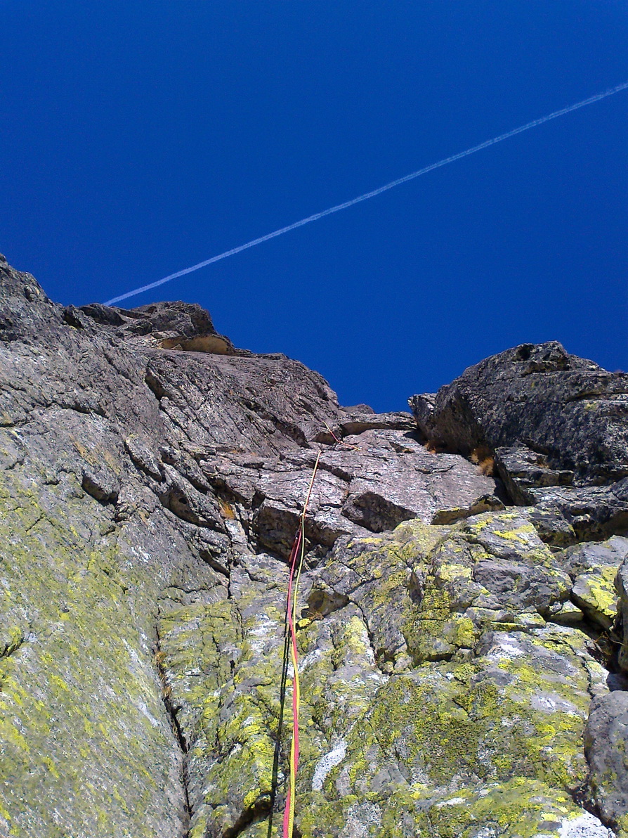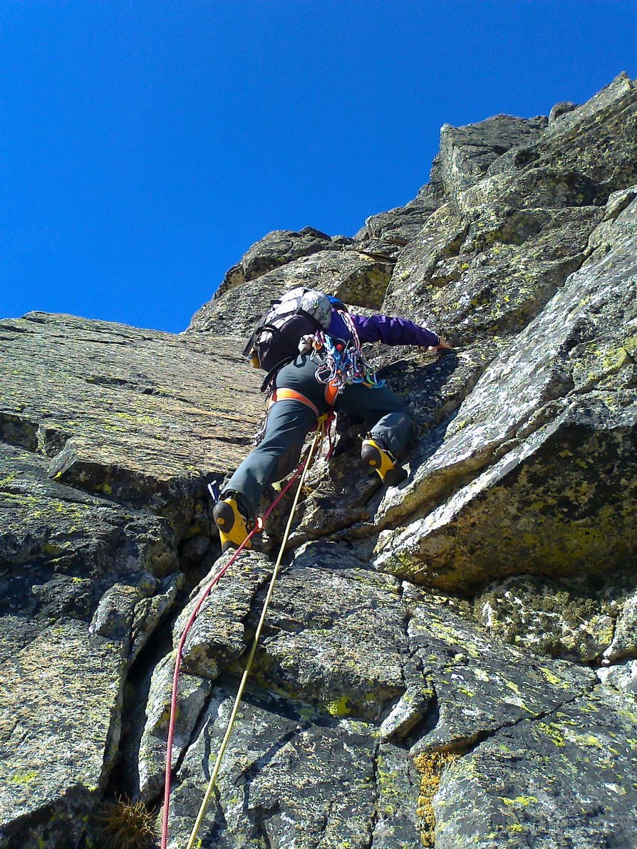 Matúš šiel viac vľavo a v tomto momente už lezie pilierom piatu dĺžku. Ani jeden z nás si nie je istý, kadiaľ presne to malo ísť, ale na pilieri už je smer jasný. Chalani nám utekajú, na pilieri je miesto kde musí aj druholezec kúsok zliezať exponovanú hranu.