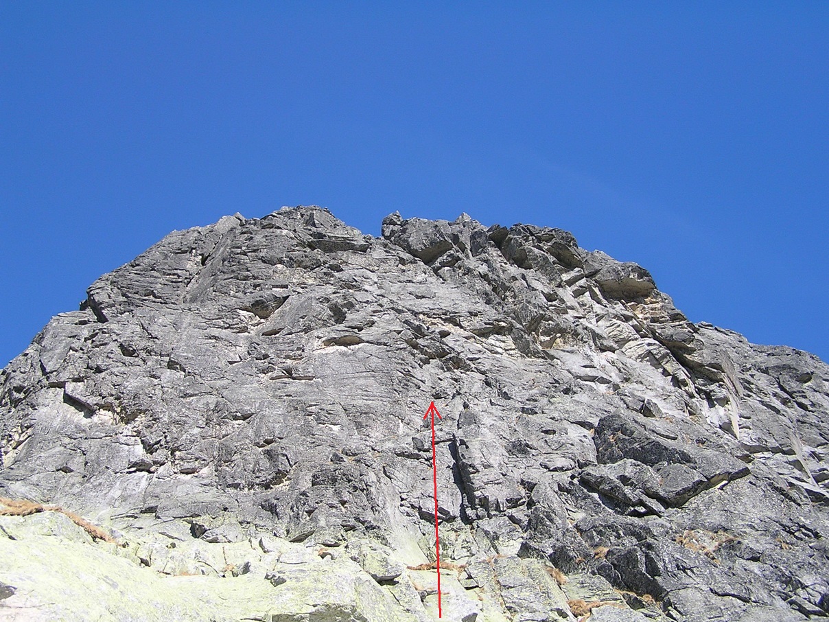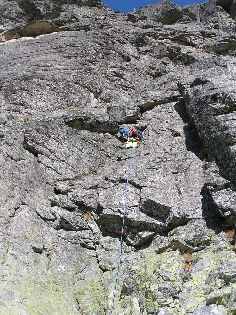 Tu sa naväzujeme. Pôjdeme dve dvojky za sebou. Následuje dĺžka pekným komínikom, po asi 40 metroch štandujeme na plošine vpravo. Tu už začína (aspoň pre nás) vážnejšie lezenie. Podľa sprievodcu je to za V. Zakladáme niekoľko vlastných istení do veľmi peknej, kompaktnej tatranskej žuly. Tretia dĺžka končí štandom na platni. Sú tam skoby,.