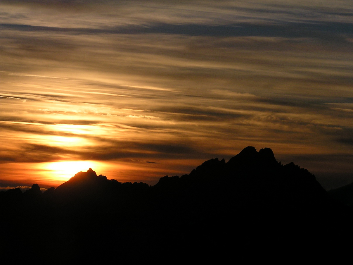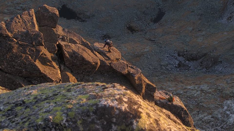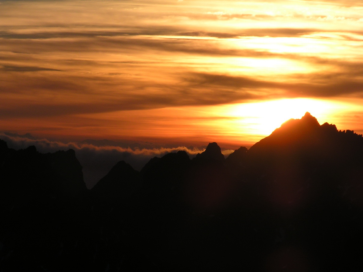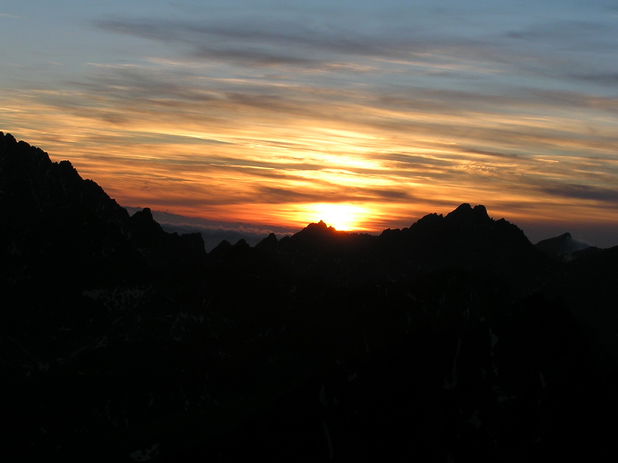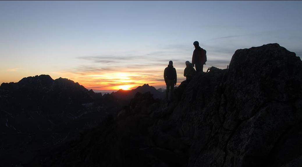 Našu poslednú siedmu dĺžku už istím na ľahkom hrebeni len cez seba. Chalani nás čakajú hore a fotia. Vychádzame na vrchol Širokej veže práve v momente západu slnka. Stres zo mňa opadáva. Sisa zachováva duchaprítomnosť a tak vznikajú fotky, vďaka ktorým potom aj tento článok :)