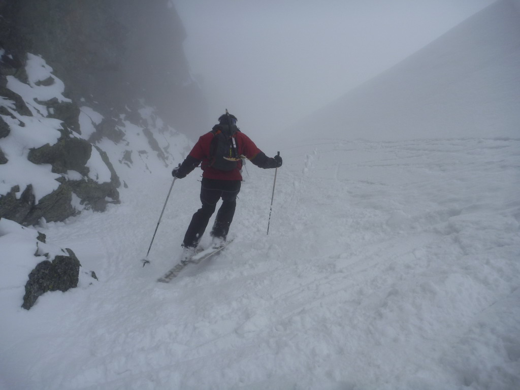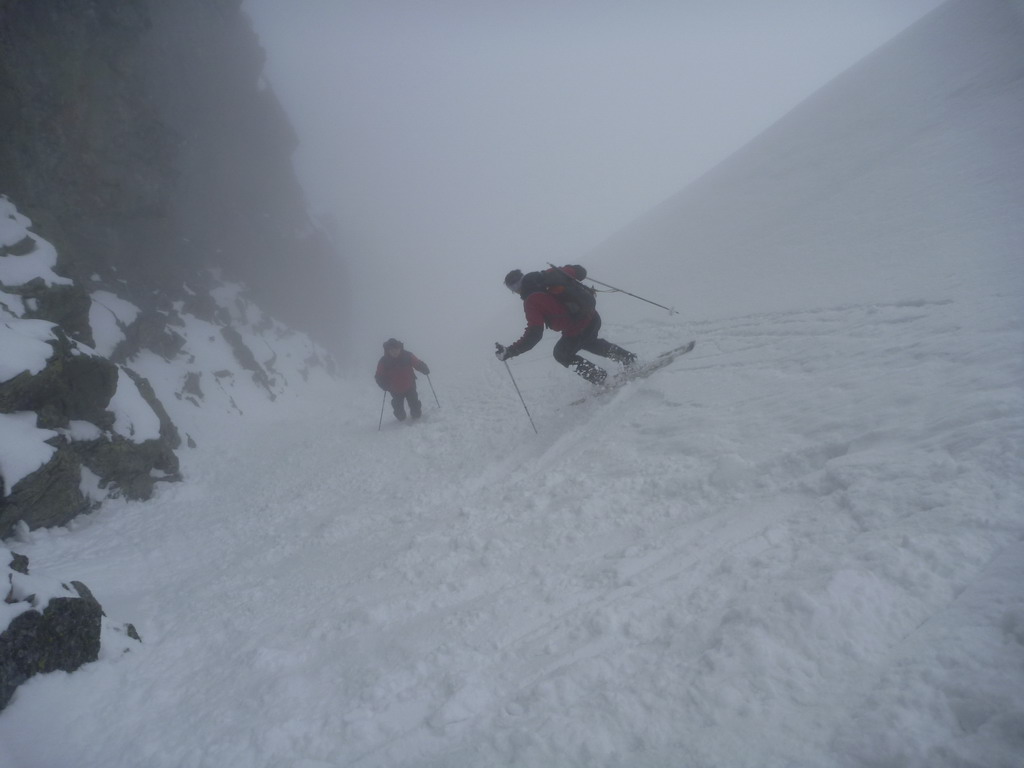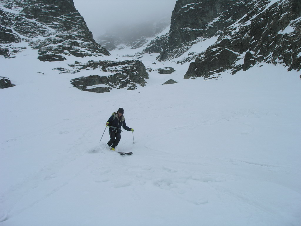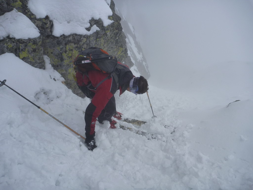 Dnes je však starý sneh dostatočne stabilný a nového je málo. Pokračujeme a za nami aj poľské družstvo. Robím stopu, vzrušenie sa stupňuje. Zdá sa mi, že idem rýchlo, ale výstup samotným žlabom trvá nekonečnú hodinu. Konečne! V štrbine spoločné foto, výhľad nulový, vrcholový úsek s reťazami si nechávame nabudúce. Hneď, ako dorazí prvý peší turista, začínam zostup na lyžiach. Prvé metre sa necítim príjemne, v spádnici je koryto a lyže mám ohnuté. Naviac pod čerstvým snehom sa objavujú skaly. Zošlapávam teda ešte zopár metrov. Na sklznicu sa mi lepí veľké množstvo čerstvého snehu. To zisťuje aj Wiktor, keď ma nedobrovoľne predbieha pomaly sa kĺzajúc so snehovými „papučami“ na hranách. Našťastie v mäkkom podklade ihneď zabrzdí paličkou. Očistím si sklznice, okolo mňa zatiaľ vystupuje druhý peší turista. Poprosím Wiktora, aby mi urobil zopár fotiek a začínam lyžovať. Po prvom preskoku sa cítim komfortne. Lyže výborne držia a opatrnými preskokmi míňam Wiktora a aj posledného vystupujúceho z trojčlenného poľského družstva.