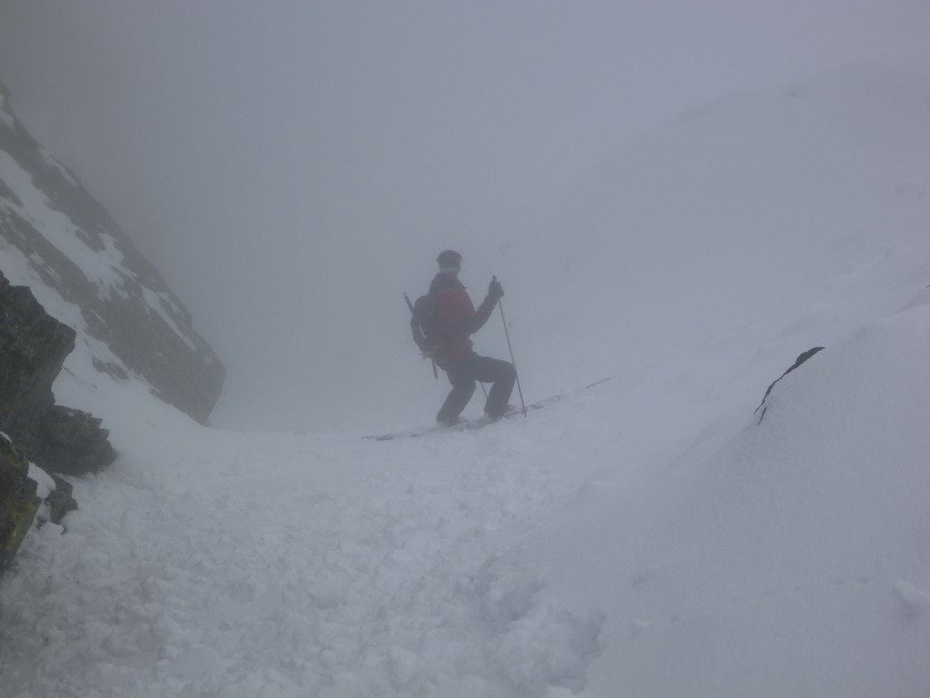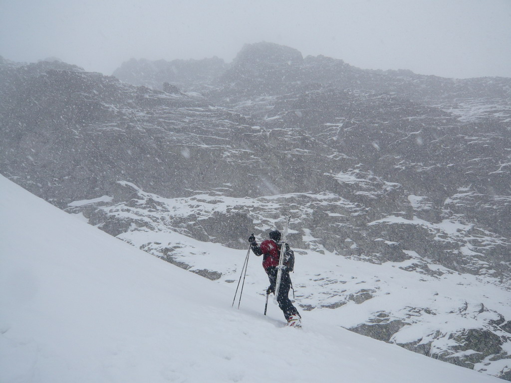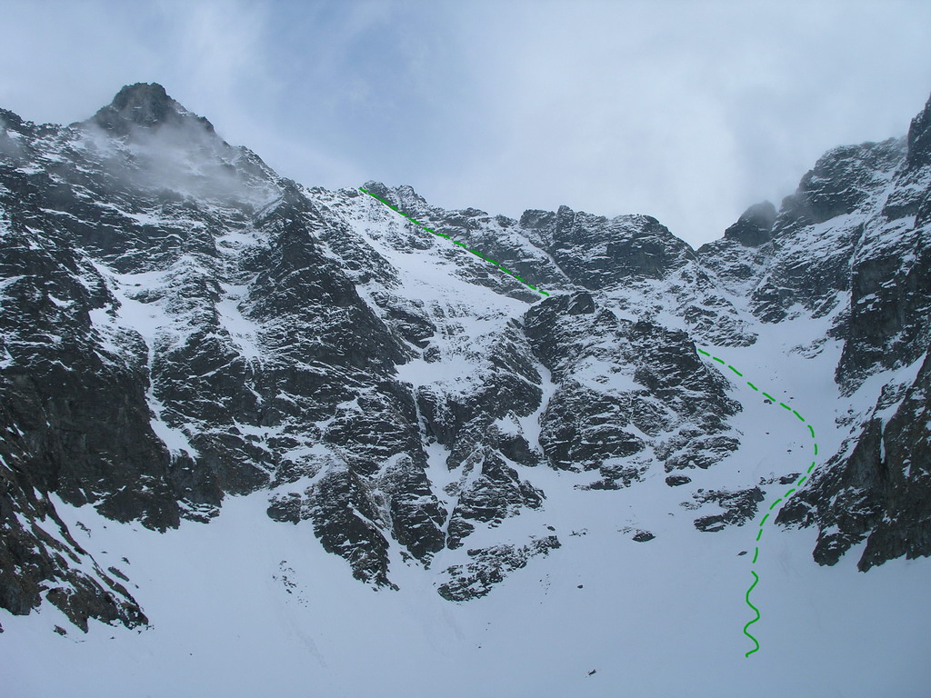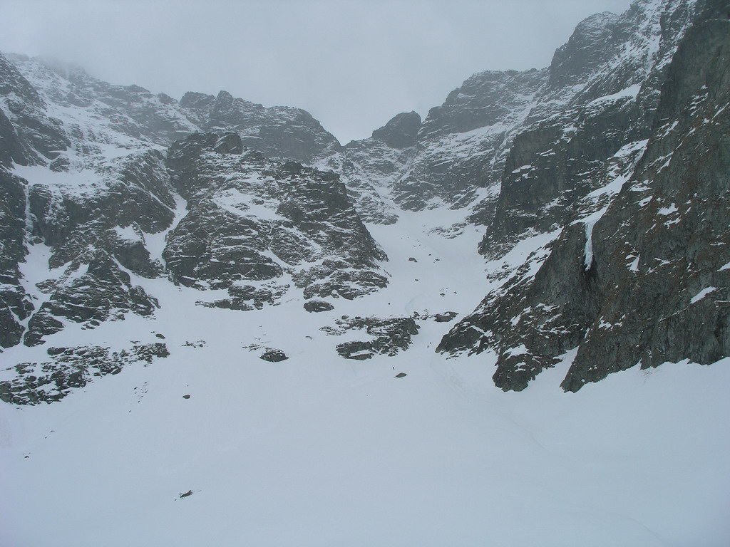 Dnes je však starý sneh dostatočne stabilný a nového je málo. Pokračujeme a za nami aj poľské družstvo. Robím stopu, vzrušenie sa stupňuje. Zdá sa mi, že idem rýchlo, ale výstup samotným žlabom trvá nekonečnú hodinu. Konečne! V štrbine spoločné foto, výhľad nulový, vrcholový úsek s reťazami si nechávame nabudúce. Hneď, ako dorazí prvý peší turista, začínam zostup na lyžiach. Prvé metre sa necítim príjemne, v spádnici je koryto a lyže mám ohnuté. Naviac pod čerstvým snehom sa objavujú skaly. Zošlapávam teda ešte zopár metrov. Na sklznicu sa mi lepí veľké množstvo čerstvého snehu. To zisťuje aj Wiktor, keď ma nedobrovoľne predbieha pomaly sa kĺzajúc so snehovými „papučami“ na hranách. Našťastie v mäkkom podklade ihneď zabrzdí paličkou. Očistím si sklznice, okolo mňa zatiaľ vystupuje druhý peší turista. Poprosím Wiktora, aby mi urobil zopár fotiek a začínam lyžovať. Po prvom preskoku sa cítim komfortne. Lyže výborne držia a opatrnými preskokmi míňam Wiktora a aj posledného vystupujúceho z trojčlenného poľského družstva.