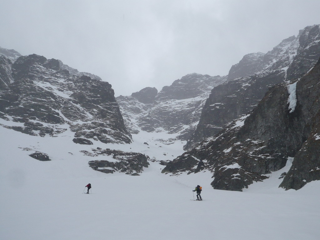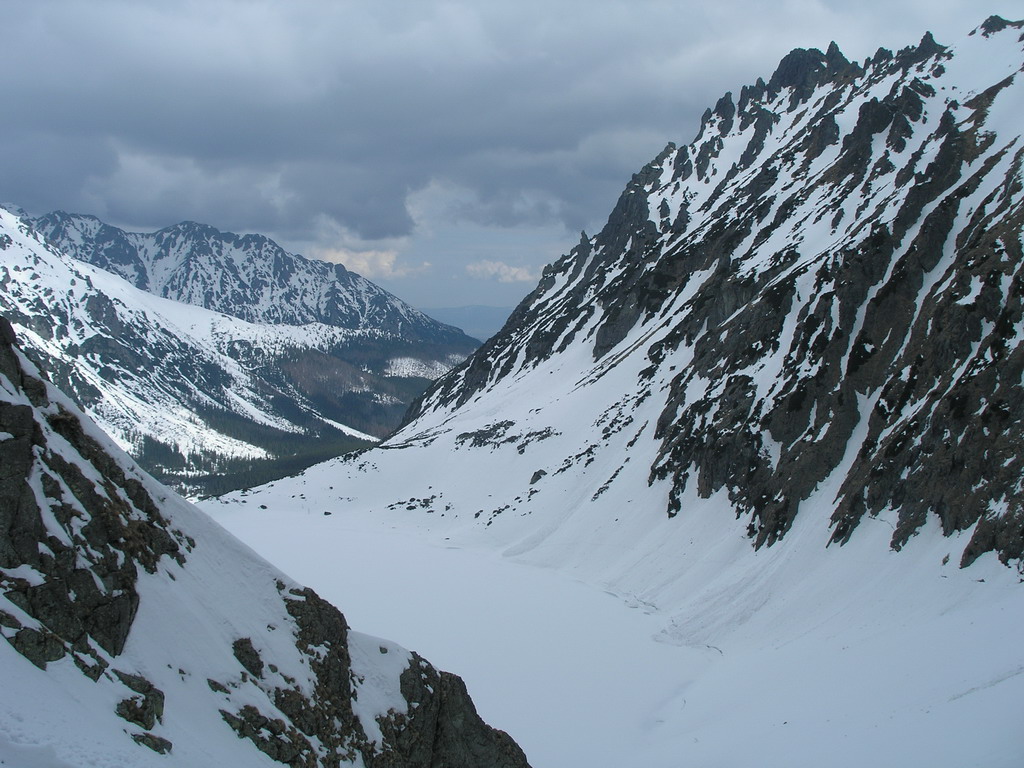 Nasleduje najkrajšia časť túry - dlhá lyžovačka žlabom, ktorý si drží svoj sklon počas celej dĺžky. Pocity umocňuje tenká vrstva nového snehu odchádzajúca spod lyží. K Czarnemu stawu už lyžujeme v mokrom snehu spoločne so Silviou. Po chvíľke oddychu zbadáme dve vzdialené postavičky bezpečne lyžovať dole svahmi okolo Buly a tešíme sa z nádherného dňa, v ktorom začína opäť dominovať spoločenská stránka. Jedna túžba sa splnila.