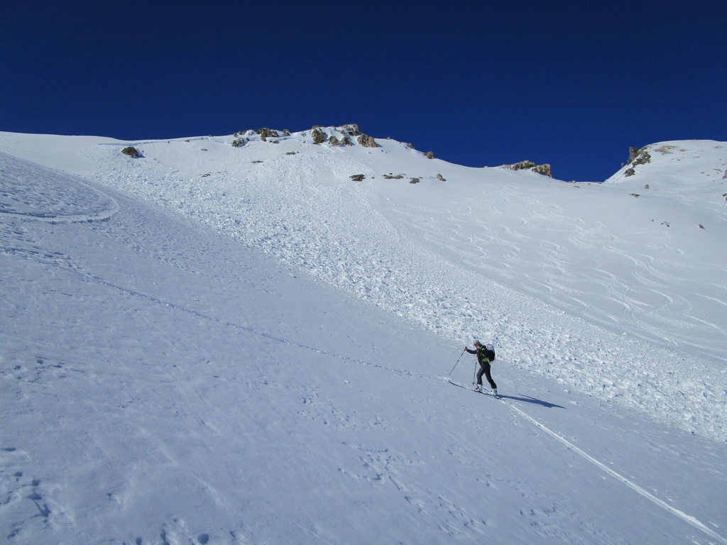 Vo vrcholovej partii sa môže v prípade tvrdého firnu vyskytnúť potreba mačiek. V ideálnych podmienkach sa dá lyžovať priamo z vrcholu.