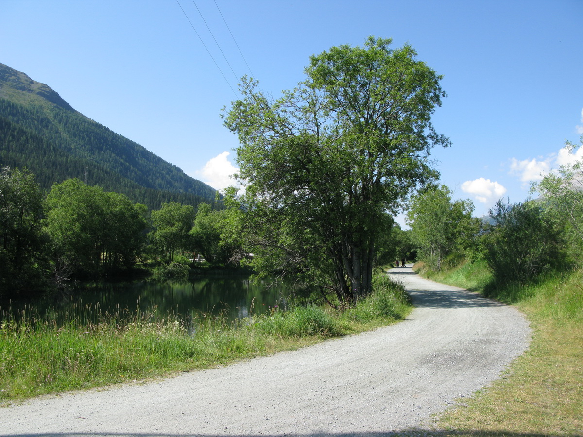 V Bergune sme sa zorientovali rýchlo, doplnili sme vodu vo fontánke a vo veľkej horúčave začíname stúpať. Najprv asfalt, potom štrková cestička a na záver parádny chodníček. Je vidieť, že to tu bolo upravené malým bagríkom a vznikol tak pohodový singlík. Zdá sa mi však trochu zbytočne široký... To pochopím až hore na chate, keď zbadám zásobovací chatový ratračik.