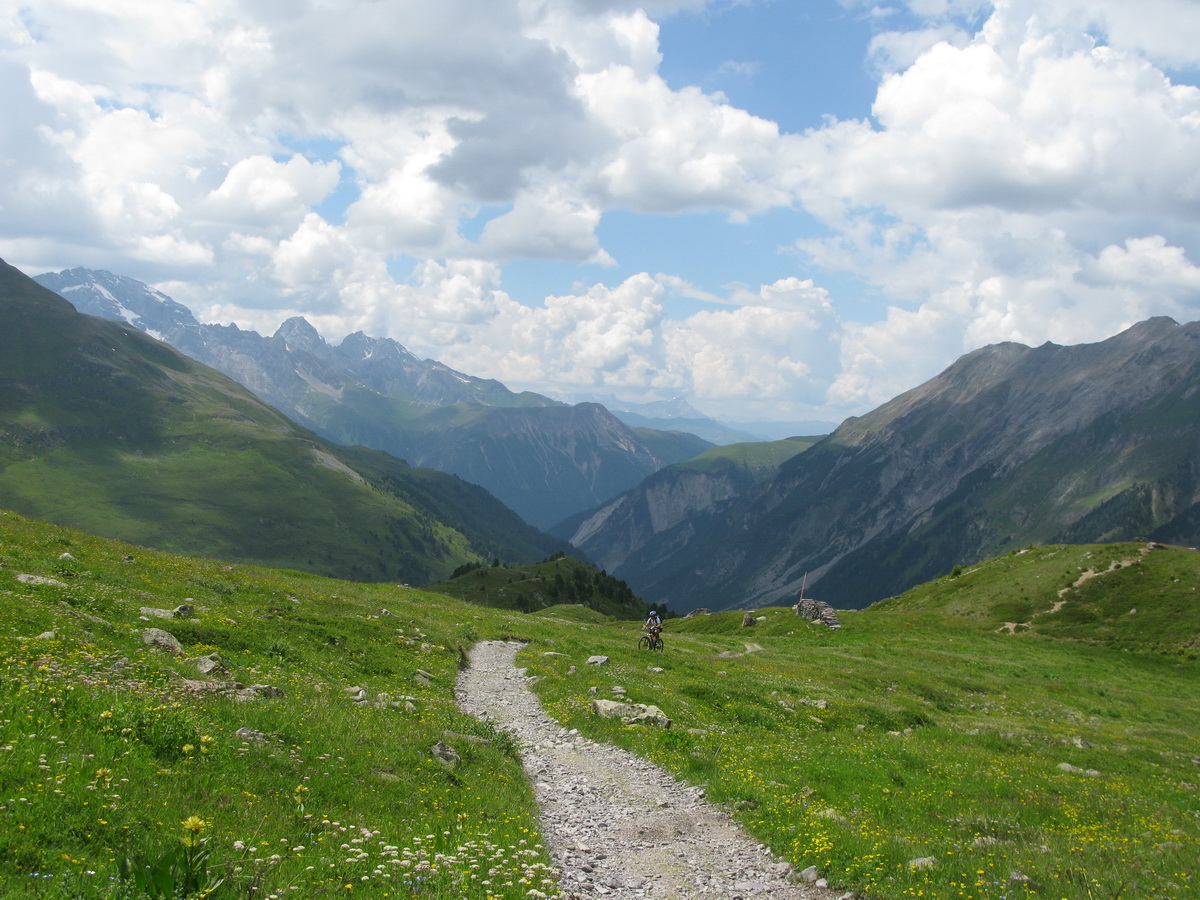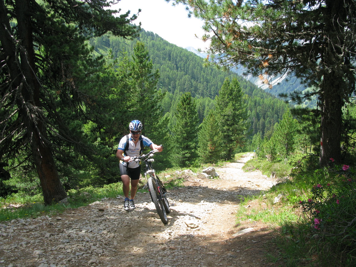 Val Susaunna však stála za to, výhľady nádherné. Zjazd už pokračoval štrkovou cestou, miestami však bola taká strmá, že v opačnom smere by bolo treba tlačiť...