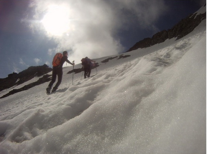 Prvá fáza je výstup cez trávnatý svah až po vodopád, kde začnete mať ten správny vysokohorský pocit. Treba sa držať potoka a širokým kuloárom sa dostanete až k jazeru. Kúsok nad jazerom sa začína (alebo končí) ľadovec. Na prechod ľadovcom za normálnych podmienok netreba žiadnu špeciálnu výbavu, nie sú viditeľné ani trhliny. Cesta nie je značená, ale treba sa cez ľadovec dostať najľahšou cestou na hrebeň, potom odbočiť vpravo a už si len vychutnávať vzdušné pohľady na skalné zrázy, ktoré sú aj niekoľko 100m hlboké.