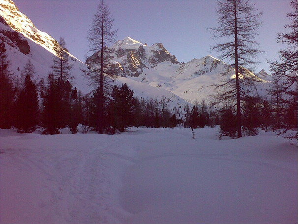 Cesta k Tschierva Hütte e trvá asi 1,5 hodiny . Hore som stretol ešte mladý párik, ktorý nocoval vo winterraume a samozrejme som sa „zakecal...“ Vraj sa plánujú ďalší deň pokúsiť o Piz Bernina cez Bianco Grad. Na zostup som sa vydal o 18tej a prvý otvorený úsek som zvládol ešte za svetla (šera), čo dole v žľabe už sranda nebola, lebo nebolo vidieť ani na krok. Napriek tomu som si prašan užil a na konci som si zjednodušil cestu po označenej bežkárskej trati, ktorá vedie pozdĺž celej doliny, skoro až k ľadovcom ...