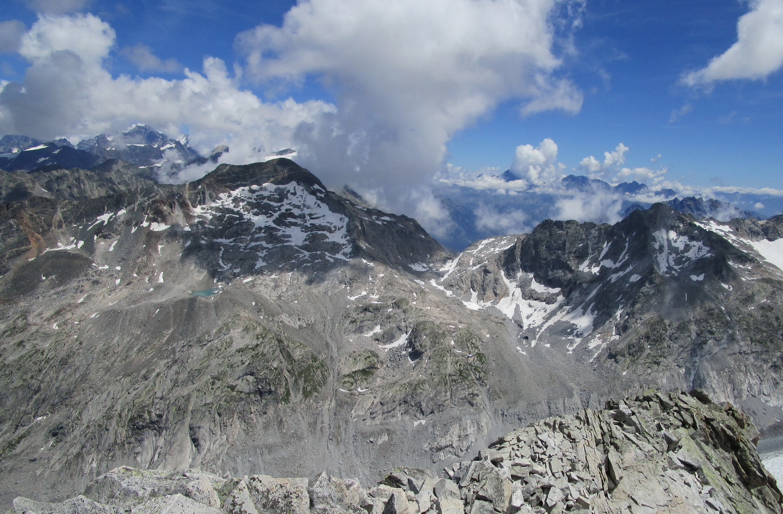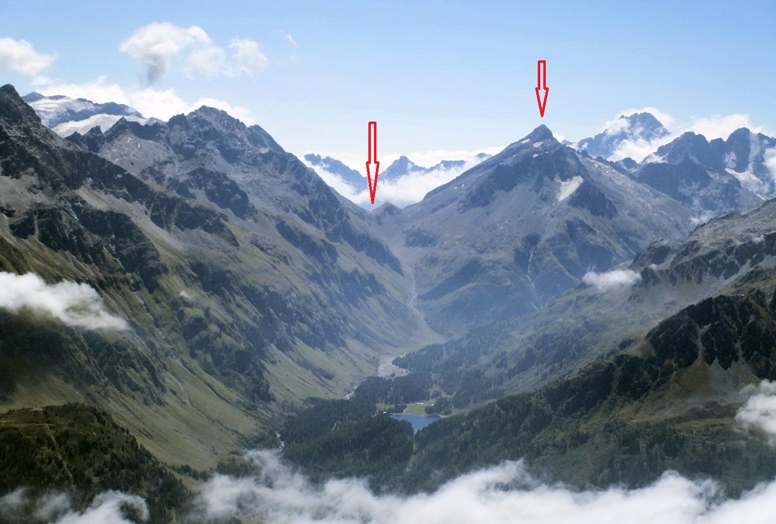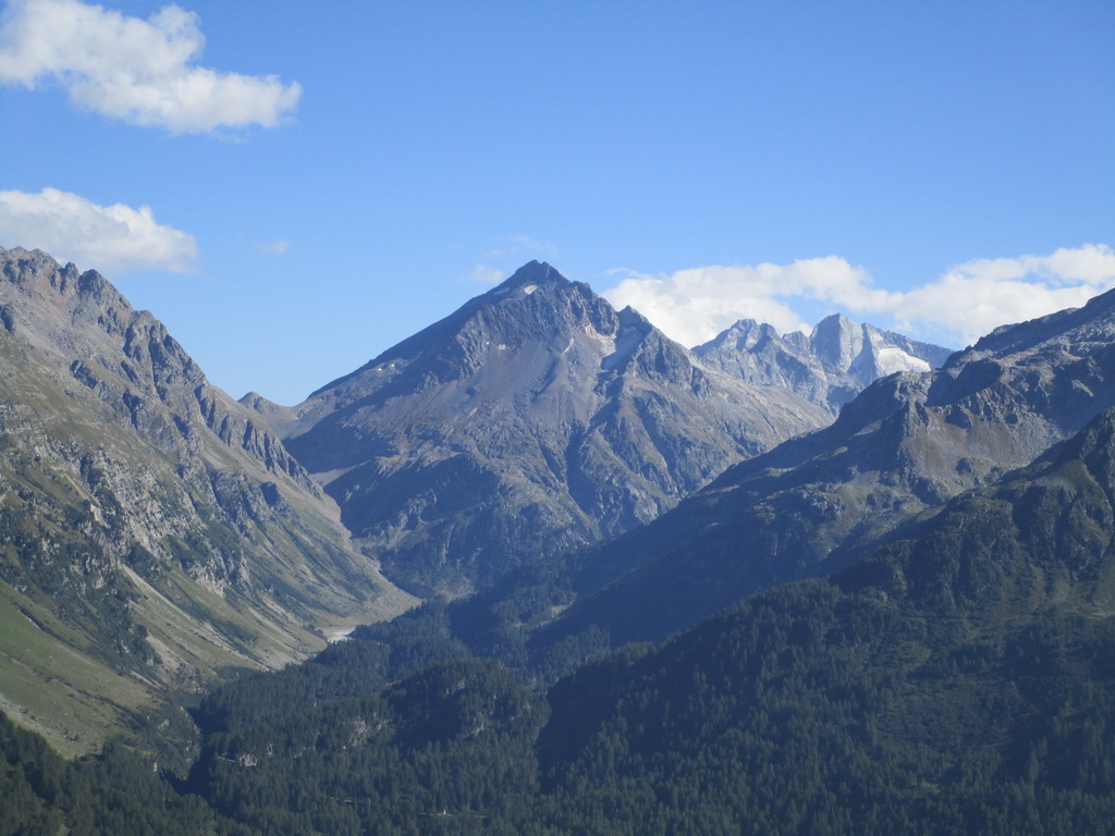 Ale odbočil som. Na vrchole Monte Forno si vychutnávam samotu a výhľady. Okrem iného vidím Val Malenco, rozľahlú taliansku dolinu na ktorú sa už chystám... Z oparu sa vynoruje Pizzo Scalino, 3323 metrov vysoká pyramída ktorá je miestom s najvyšším počtom pozorovaní UFO v Taliansku. Paráda! Možno stretnem aj nejakých ďalších zelených mužíkov.