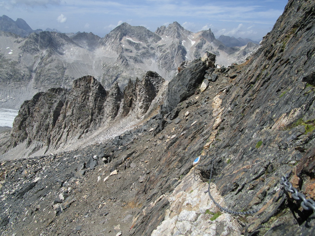 Prichádzam do passo Forno. Tu sa z červenej značky oddeľuje modrá, vysokohorská trasa na vrchol Monte Forno. Najťažší úsek je zabezpečený hrubými reťazami. Žiadna ferrata, je potrebné sa spoliehať na trenie obuvy a silno sa držať :)